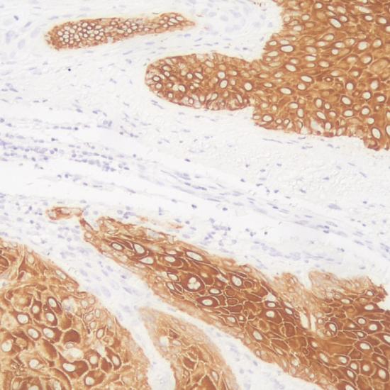 高分子量角蛋白,是CK1、CK5、CK10和CK14的混合物,表達(dá)于正常鱗狀上皮、基底細(xì)胞和肌上皮,也可表達(dá)于導(dǎo)管上皮和其它復(fù)層上皮。腫瘤組織表達(dá)于鱗狀細(xì)胞癌、膀胱移行細(xì)胞癌、鼻咽癌、胸腺瘤和上皮樣間皮瘤,也表達(dá)于乳腺、胰腺、膽管和涎腺的導(dǎo)管癌。34βE12是前列腺基底細(xì)胞特異性標(biāo)記抗體,聯(lián)合P504S和p63用于前列腺癌的診斷。
