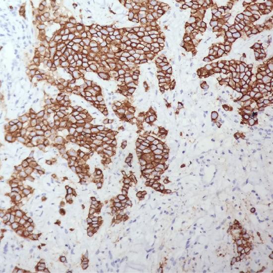 E-cadherin是一種跨膜糖蛋白,屬于鈣離子依賴的粘附分子家族,在組織的生長發(fā)育中發(fā)揮重要作用,其功能的降低或喪失可導(dǎo)致細(xì)胞連接的破壞,與腫瘤細(xì)胞的浸潤和轉(zhuǎn)移相關(guān)。在許多腫瘤中,其表達(dá)均有所改變,表達(dá)下降往往標(biāo)志預(yù)后不良。E-cadherin表達(dá)于乳腺導(dǎo)管癌,而在小葉癌不表達(dá),可用于兩者的鑒別。